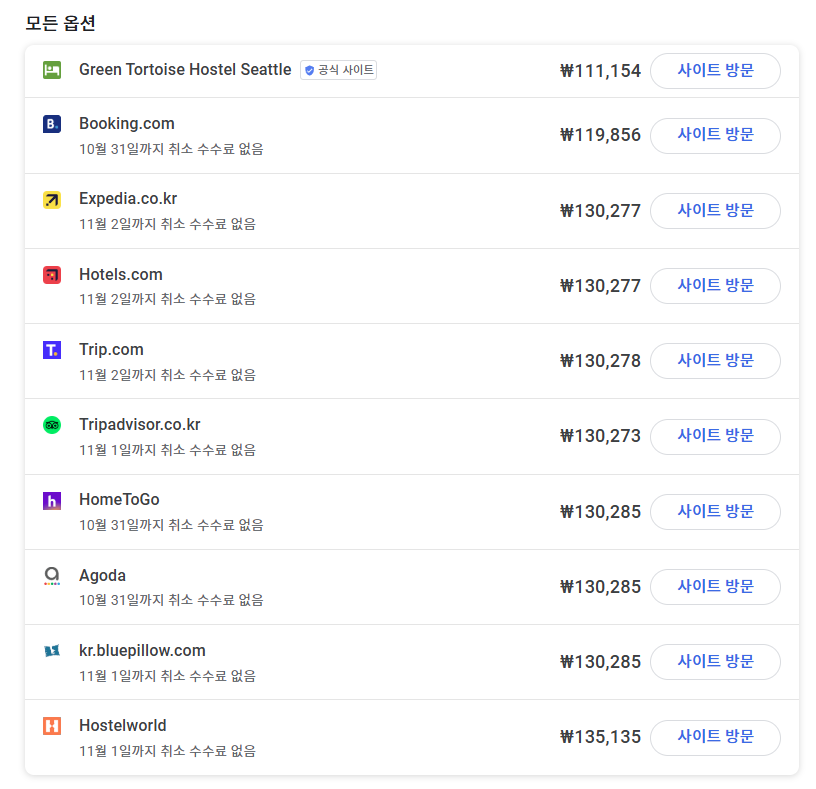 예약 플랫폼별 호스텔 가격 비교, 출처: Google
