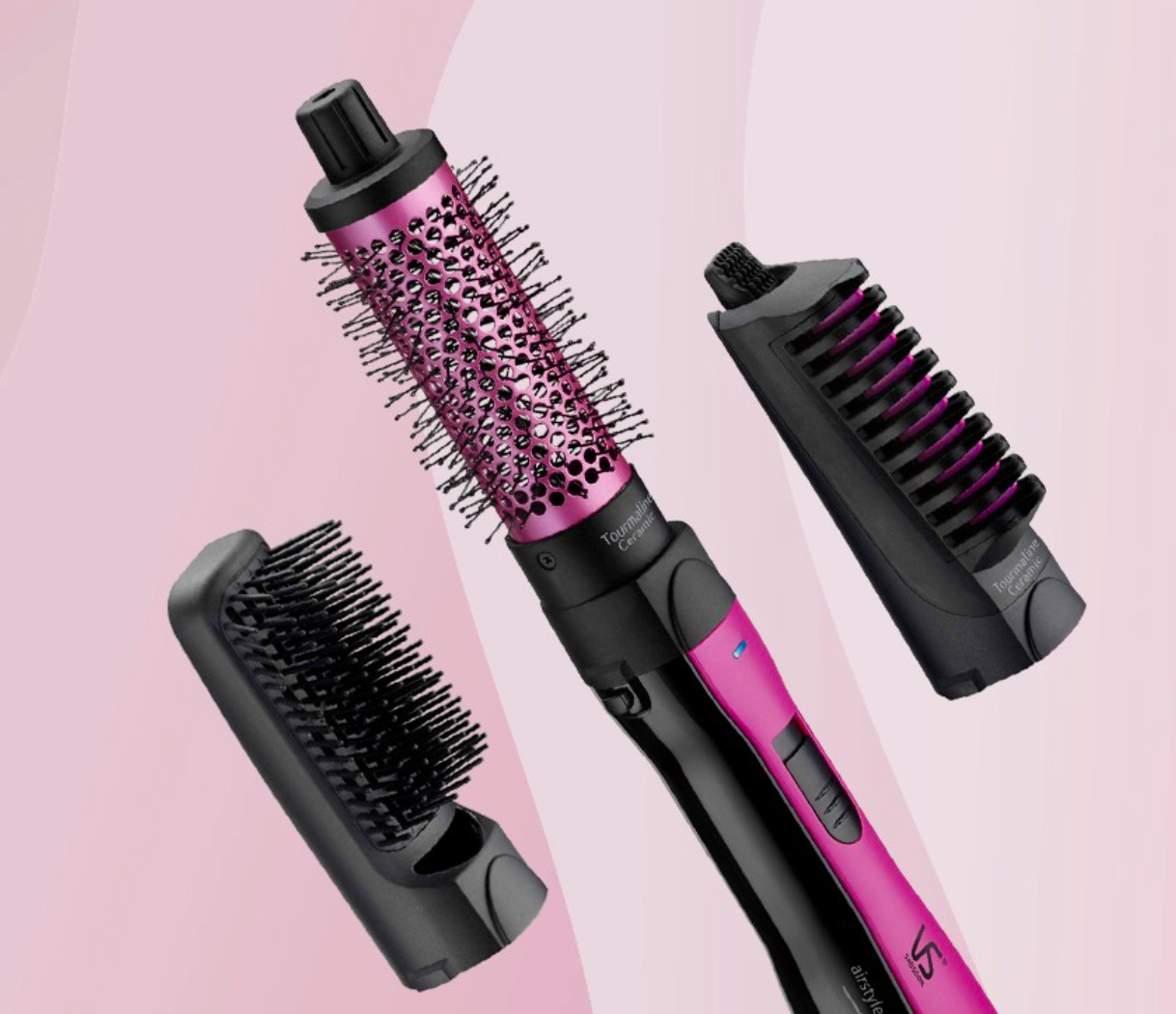 비달사순 토르말린 세라믹 이온 스타일러(이하 비달사순 스타일러)는 이름은 거창하지만 ‘바람 나오는 브러쉬’라고 보면 됩니다. 본체 하나에 3개의 브러쉬를 바꿔 끼워 쓰는 구조로, 열과 바람을 동시에 써서 스타일링을 도와줍니다. 버튼을 위아래로 조정해 바람 세기를 두 단계로 조절할 수 있고, 마무리할 때 쓰면 딱 좋은 냉풍 기능도 들어 있습니다. 제품명의 ‘토르말린’이 무엇인가 했더니, 코팅에 들어간 성분이더라고요. 열판에 토르말린(전기석) 세라믹 코팅이 되어 있어서 흠집이 잘 안 나고, 모발 손상도 덜하다고 합니다.