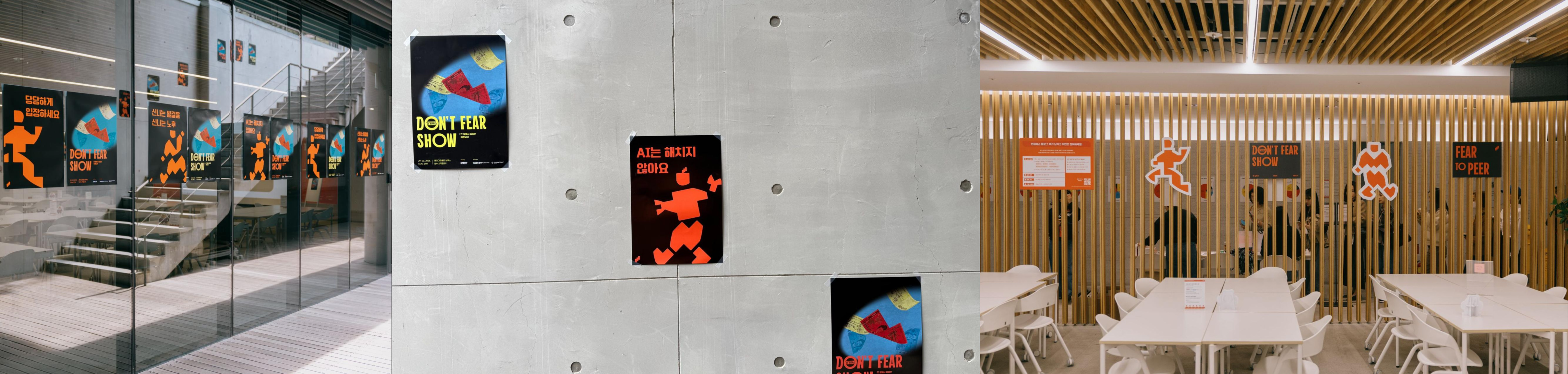 STEP 1 – 입장부터 ‘두려움’ 부수기! 입구엔 참가자분들의 당당한 태도와 즐거운 노후를 응원하는 포스터의 행렬이 이어졌어요. 포스터 속 거인 같기도, 로봇 같기도 한 일러스트는 어피티 로고를 새로운 이미지로 재구성한 비주얼이에요. |