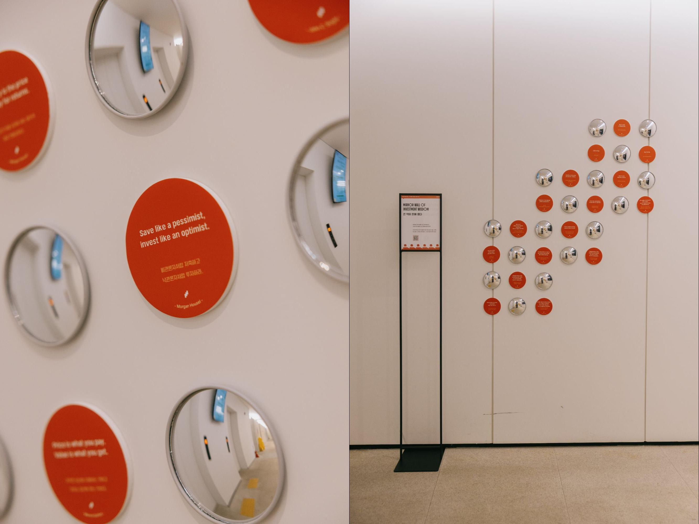📸 [쓴 약이 돈에 좋다] 포토존: 머니레터 <쓴 약이 돈에 좋다> 시리즈에서 인용한 세계적인 투자자들의 명언과 거울을 교차해 어피티 로고 모양으로 전시했어요. 마음에 드는 문장과 함께 세미나에 참여한 내 모습을 한 번에 담을 수 있는 만능 포토존이죠? 어떤 내용들이 담겨 있었는지 사진을 통해 자세히 살펴보세요. |