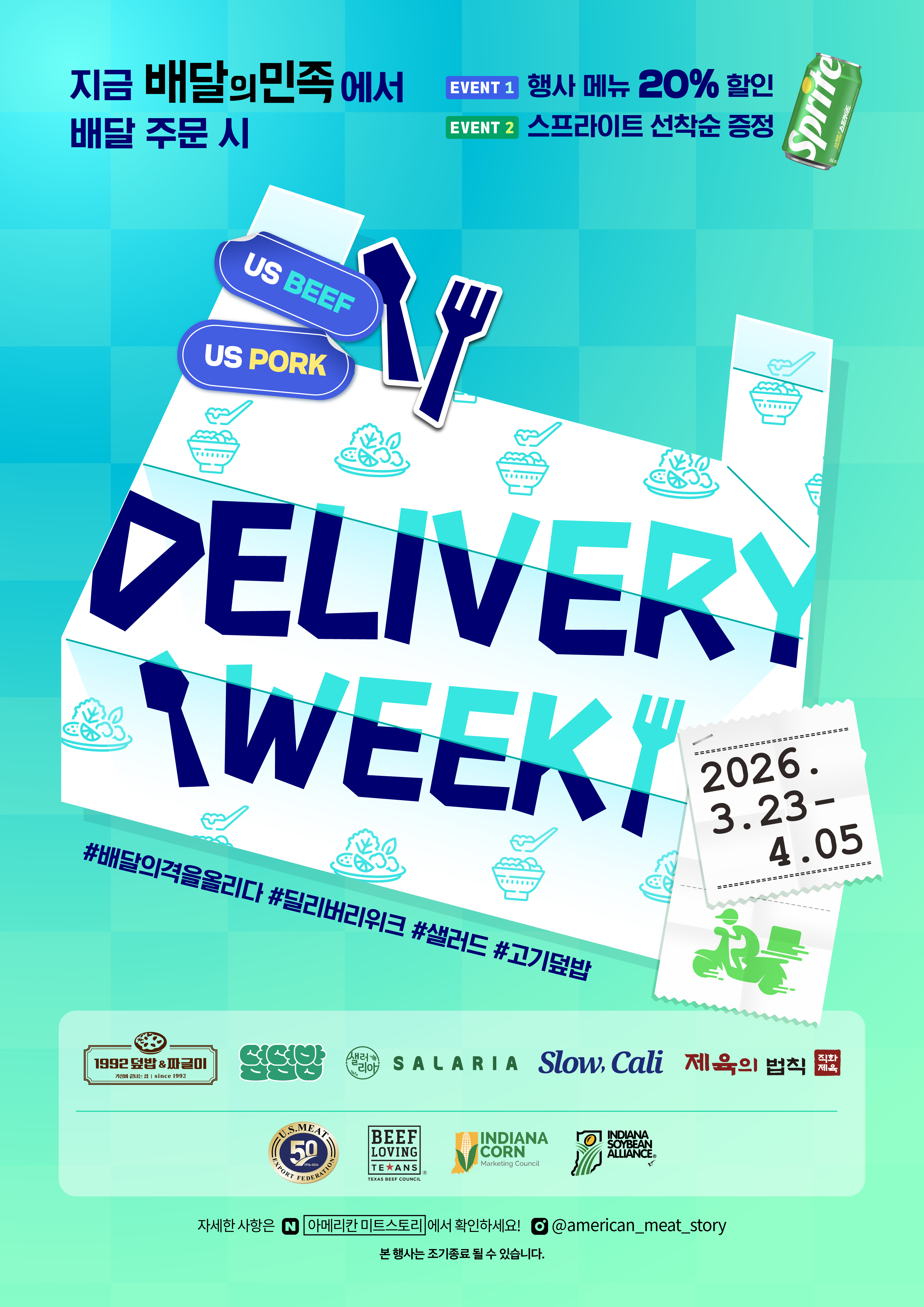 맛과 영양을 모두 챙긴 한 끼를 찾고 계신다면 ‘2026 딜리버리위크 시즌1’을 주목해보세요. 미국산 소고기와 돼지고기는 양질의 곡물을 먹고 자란 소와 돼지에서 생산돼 맛과 품질이 뛰어나답니다. 이 특별 메뉴를 3월 23일부터 딱 2주간만 20% 할인된 가격에 맛볼수 있어요. 여기에 스프라이트 캔 350ml 선착순 증정 혜택까지 야무지게 챙겨보세요!