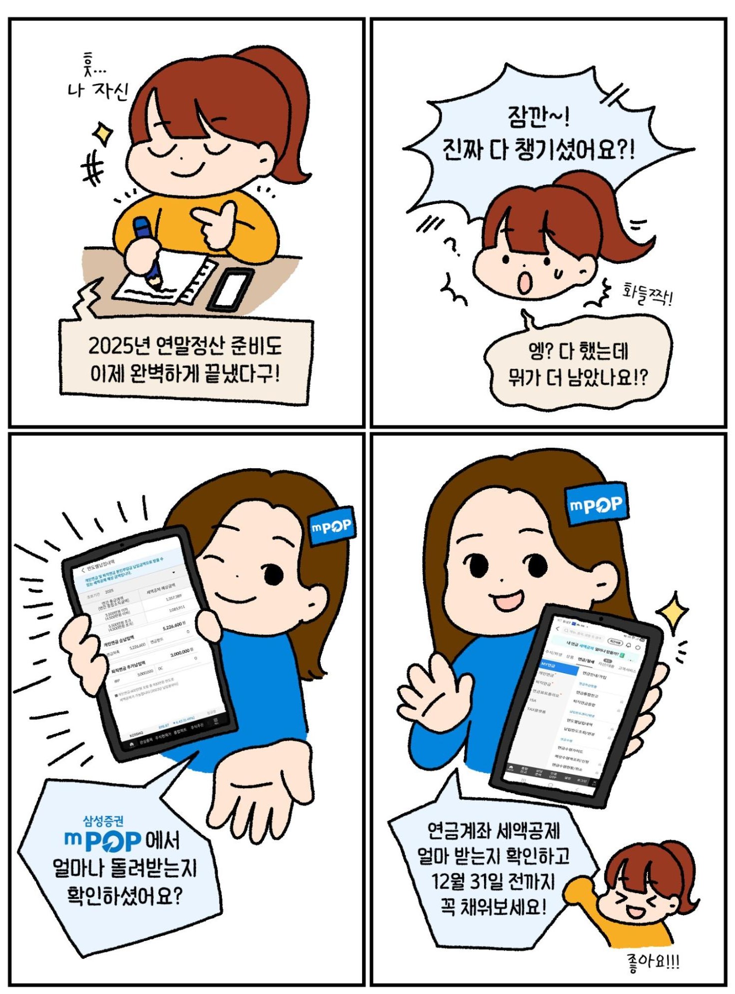 확인해보니, 금액이 적게 나왔다고 하더라도 아직 늦지 않았어요! 12월 31일까지 납입한 금액이 올해 세액공제 대상이니까요. 지금이라도 추가로 납입하면 세액공제 혜택을 더 많이 받을 수 있거든요. 지금 바로 삼성증권 mPOP에서 납입 현황을 확인하고 연말정산 계획을 세워보세요.