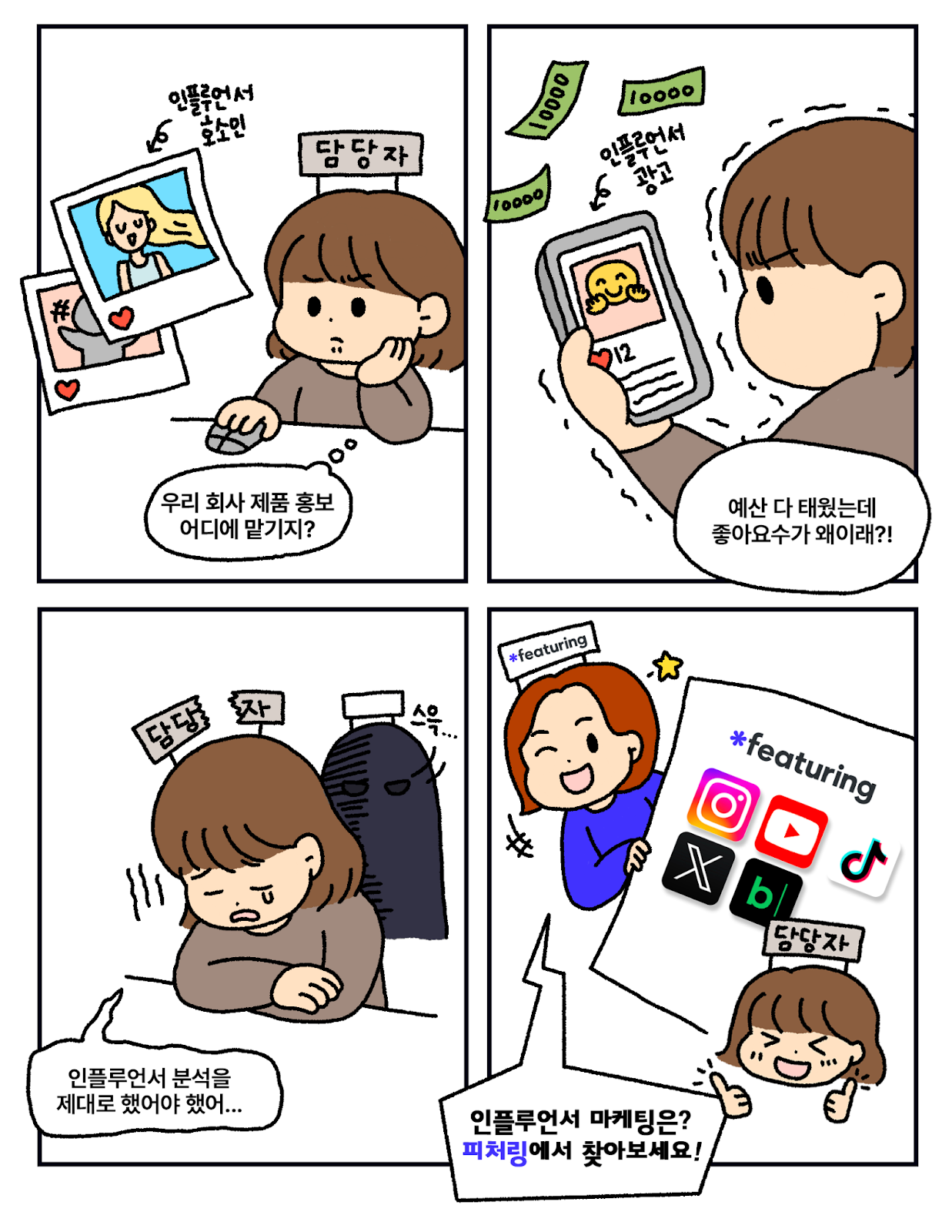 이와 비슷한 상황에 놓이신 분들이라면 누구든, 아시아 최대 규모의 SNS 데이터 엔진을 보유한 인플루언서 마케팅 전문 솔루션 ‘피처링’을 선택하세요.