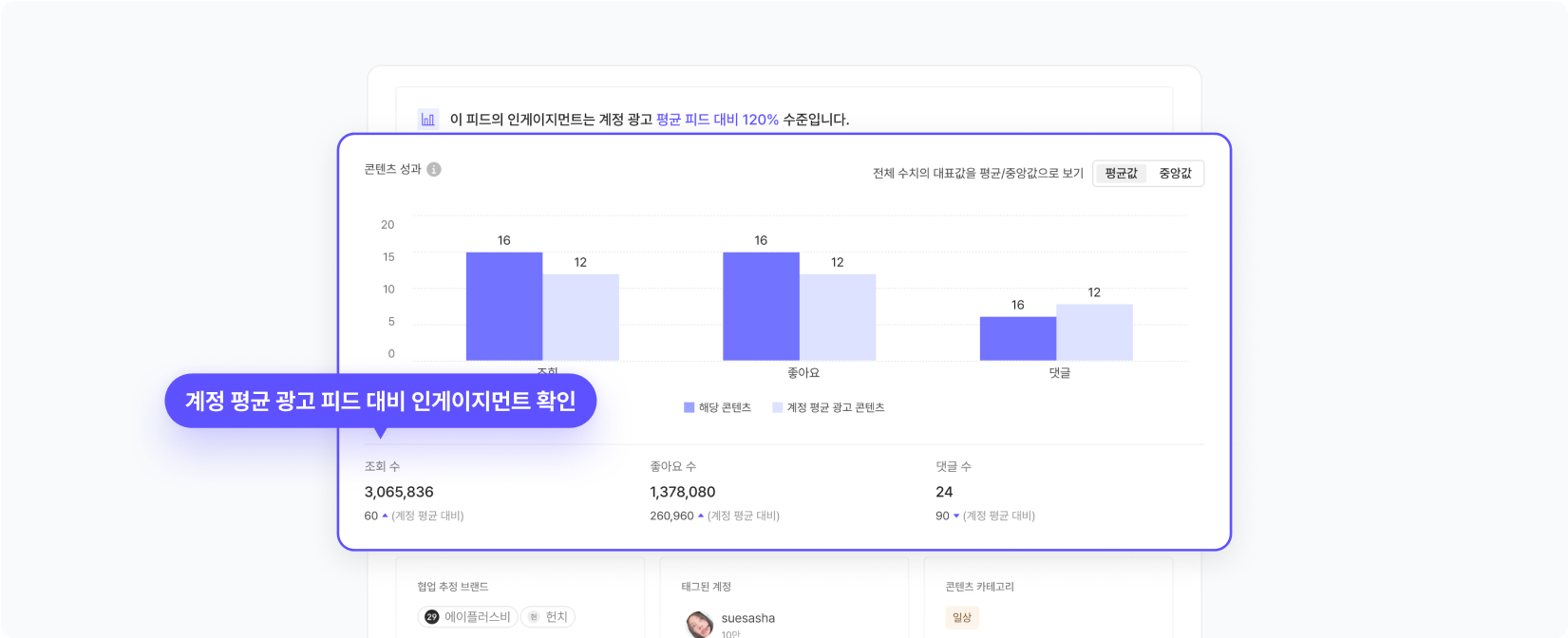 알고 보니 그 인플루언서는 같은 카테고리 내에서도 숙소 리뷰에 특화된 콘텐츠를 만드는 사람이었기에 축제 콘텐츠는 평소 팔로워의 관심사와는 맞지 않았던 거예요. 높은 단가를 들인 만큼 성과가 확실하게 보장된 인플루언서라고 생각했던 것이 무색하게도 말이죠. 이 경험 덕분에 팔로워 수가 많다고 해서 무조건 성공하는 건 아니고, 우리 브랜드와 잘 맞는 사람을 데이터로 정확히 판단해야 한다는 사실을 깨닫게 되었죠.
