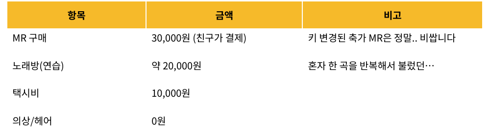 A. 주변에 알아본 결과… 10~30만 원이 평균인 것 같아요. 전문 가수를 섭외하는 경우 수십에서 수백만 원이 드는 걸로 알고 있어요. 당연히 금액의 절대 기준보다는 상황과 마음이 더 중요하겠죠!