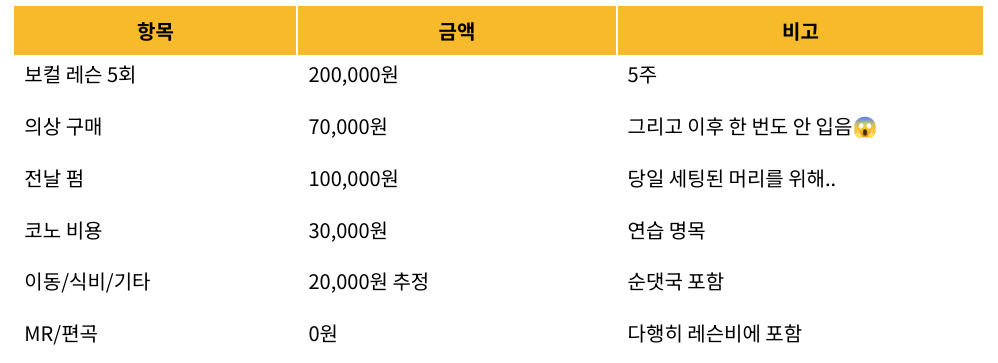 A. 길면 길수록 좋을 것 같아요. 꼭 직접 불러보는 게 아니더라도 틈틈이 원곡을 들어보고 가사를 익히는 과정이 있으면 좋아요. 결국 투자한 시간만큼 실전에 대한 부담을 적게 만들 수 있어요. 노출 횟수가 곧 안정감이랄까요.