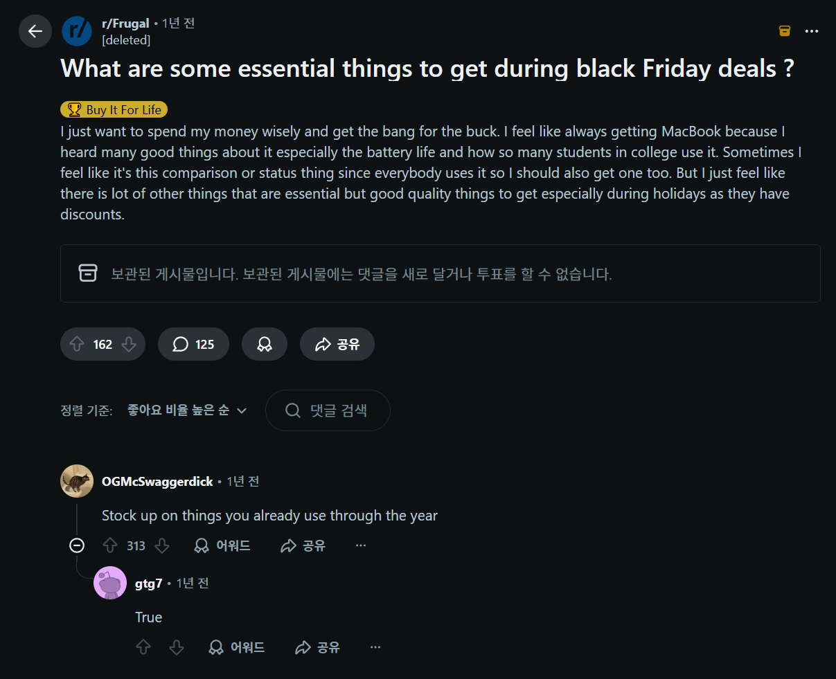 블랙프라이데이 추천 딜을 묻는 질문에 1년 치 물건을 쟁겨두라고 대답한 댓글, 출처: 레딧