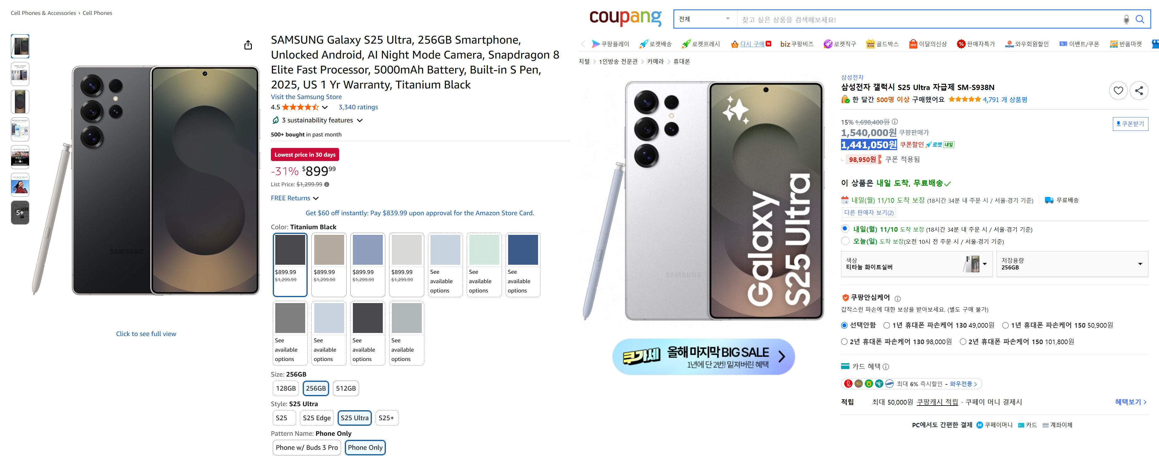 블랙프라이데이의 할인 혜택은 분명히 크지만 상황에 따라 더 불편할 수 있어요. 갤럭시 S25 울트라로 예를 들어볼게요. 지금 아마존 블랙프라이데이 세일로 해당 기종은 900달러에 판매되고 있어요. 쿠팡 최저 할인가는 1,441,050원이고요.