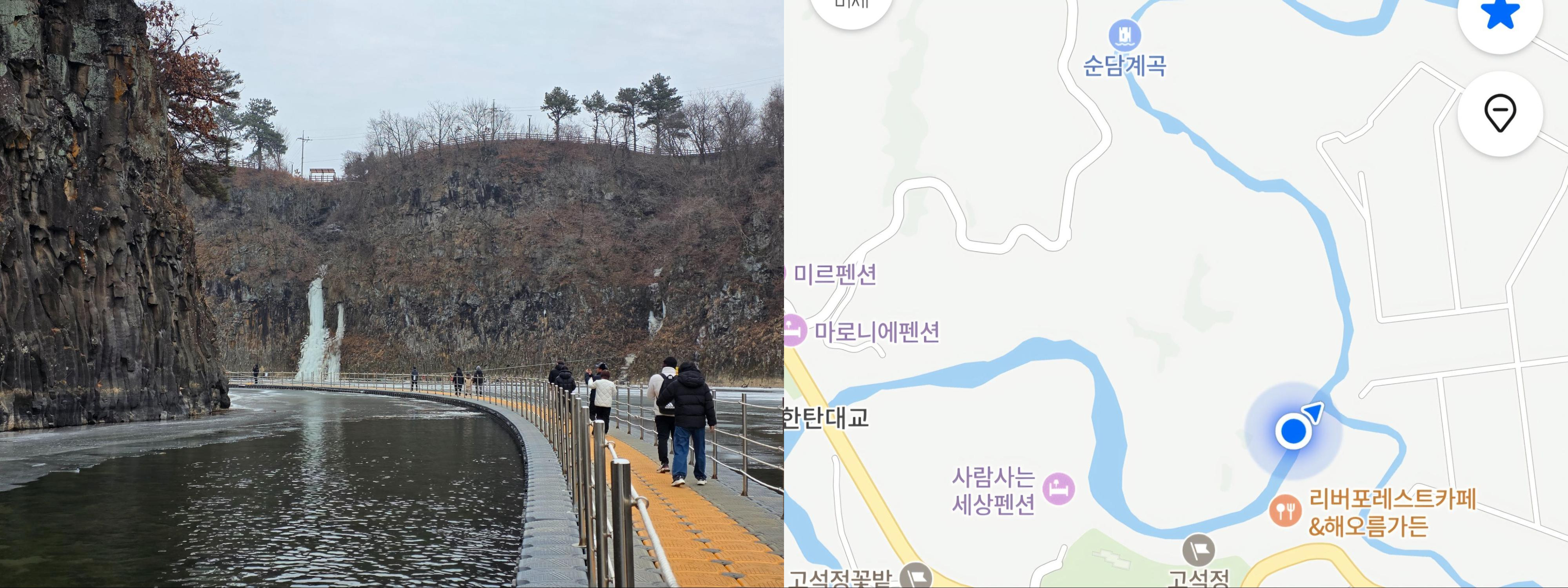 ๋ฐฅ์ ๋จน๊ณ ๋ค์ ๋ง์ง๋ง ํฌ์ธํธ์ธ ์๋ด์ ํฅํด ๊ฑท๊ธฐ ์์ํ์ด์. ์ผ์์ด ๊นจ์ง ์ฌ์ด๋ก ๋ด๋ ค๋ค๋ณด์ด๋ ๊ฐ๋ฌผ์ ์์ฌ์ด ๊ฝค ๊น์ด ๋ณด์์ด์. ๊ทธ๋ฐ๋ฐ ๋ฌด์ฒ ๋ฌผ์ด ๋ง๊ณ ํฌ๋ช