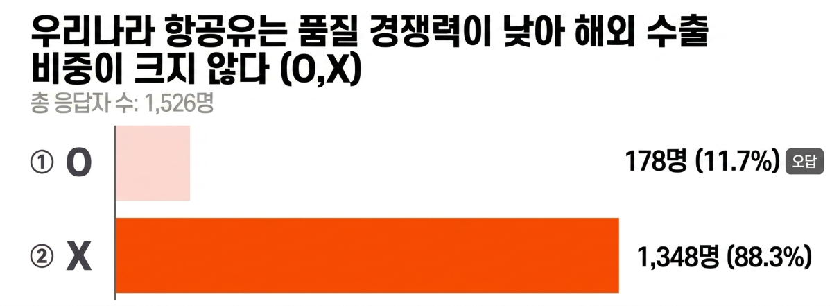 จ์ด์. 5๊ฐ์ ๋ฌธ์ ์ค ์ค๋ต๋ฅ ์ด ๋์๋ ๋ฌธ์ ๋ 1๋ฒ โ์ฐ๋ฆฌ๋๋ผ ํญ๊ณต์ ๋ ํ์ง ๊ฒฝ์๋ ฅ์ด ๋ฎ์ ํด์ธ ์์ถ ๋น์ค์ด ํฌ์ง ์๋คโ๋ผ๋ ๋ฌผ์์ ์ณ๊ณ ๊ทธ๋ฆ์ ๊ณ ๋ฅด๋ ๋ฌธ์ ์์ด์. ์ ๋ต์ โก โXโ์์ต๋๋ค.