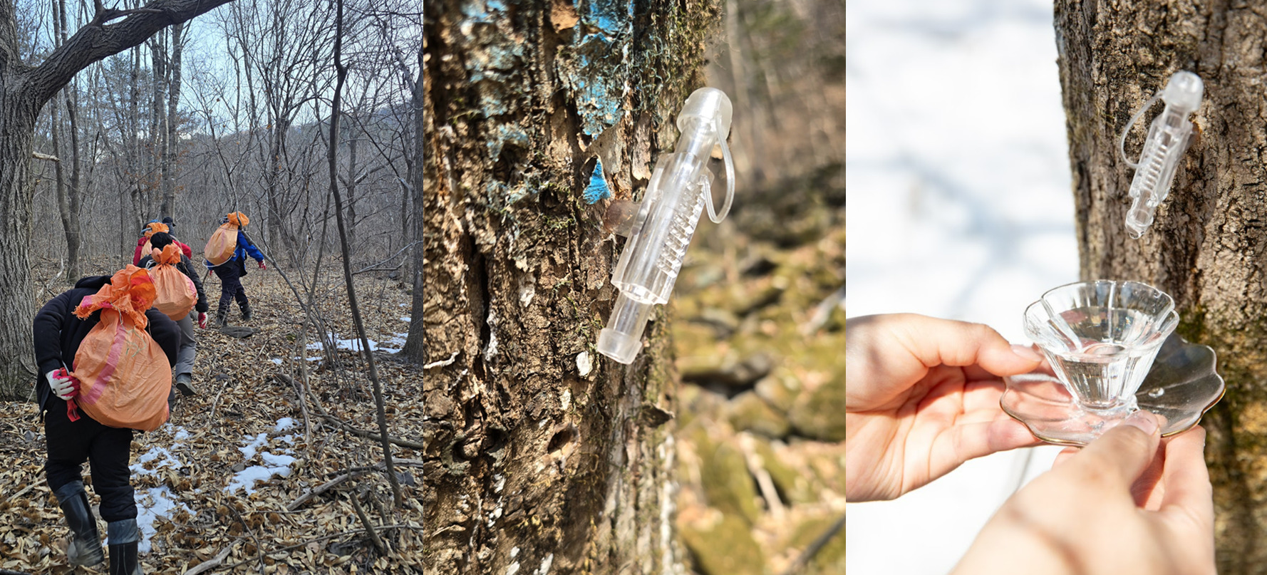 채취 방법도 생각보다 섬세해요. 나무에 작은 구멍을 내고 호스를 연결하면 나무가 스스로 올리는 수액이 자연스럽게 흘러내려오는 방식이에요. 사람이 짜내는 게 아니라 나무가 계절의 변화를 느끼며 스스로 내보내는 거죠. 기온이 계속 따뜻해지면 나무가 잎을 틔울 준비를 시작하면서 수액 흐름이 멈춰요. 그러면 그해 채취는 끝이에요.